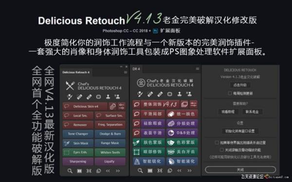 DR4完美破解汉化版全网首发DR4.13本人完美破解汉化版DR4 Delicious Retouch 4(简称DR4插件扩展面板)是一款很优秀的Photoshop人像美容插件。DR4扩展面板专注人像修饰,插件中包含多种适用于人像修饰的功能,可以快速进行人像美容修饰,插件适用于影楼快速美容磨皮以及摄影师人像后期处理等方面。Delicious Retouch 4.0中文汉化测试支持win+Mac PS CC 2018。