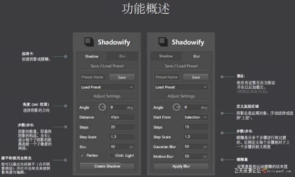 注:Shadowify插件除了可以制作(长)投影,还可以生成各种模糊效果。