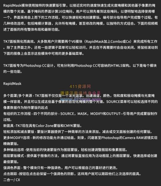 多个面罩/多个来源 – TK7面板不仅仅是一个发光面罩。创建通道,颜色,饱和度和振动掩模与光度掩模一样容易,并且可以生成这些基于像素的自羽化掩模的整个光谱。SOURCE菜单可以轻松选择不同的像素数据作为制作蒙版的起点有组织的工作流程 – 四个不同的部分 – SOURCE,MASK,MODIFY和OUTPUT–引导用户完成蒙版制作过程。新面具 -TK7现在具有Color Zone蒙版和CMYK蒙版。轻松添加和减去蒙版 – 蒙版计算器提供了一种简单的方法来添加,减去或交叉面板创建的任何蒙版。更多MODIFY选项 – 新的修改功能允许通过绘画,刻录,闪避甚至Photoshop的Camera RAW滤镜实现精确蒙版。多种输出选项 -使用当前的快速蒙版作为图层蒙版,轻松创建调整图层和像素图层。图层蒙版模式 – 提供基于图像的方法,通过将蒙版直接应用为活动图层上的图层蒙版,快速选择或创建最佳蒙版。强调色界面 – 整个模块只有一种强调色,用户可以根据自己的喜好进行更改。点击跟踪 -按钮在点击后保留一个强调色的阴影,这样用户就可以跟踪他们上次选择的面具。二合一/ CX