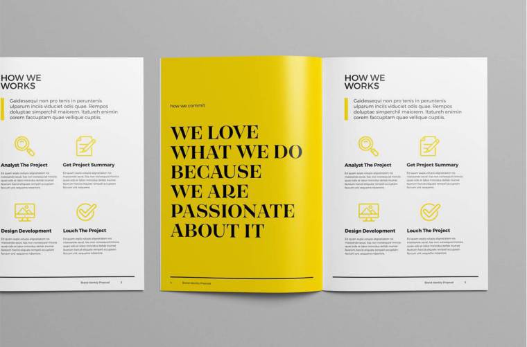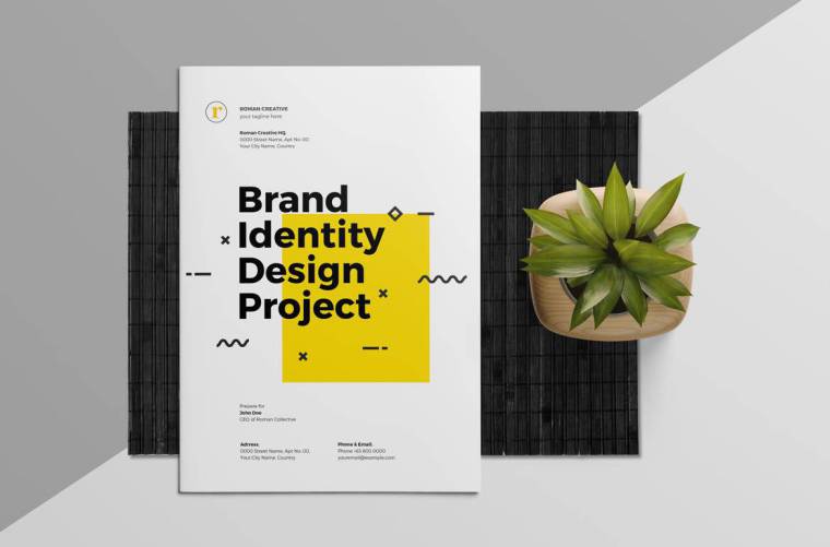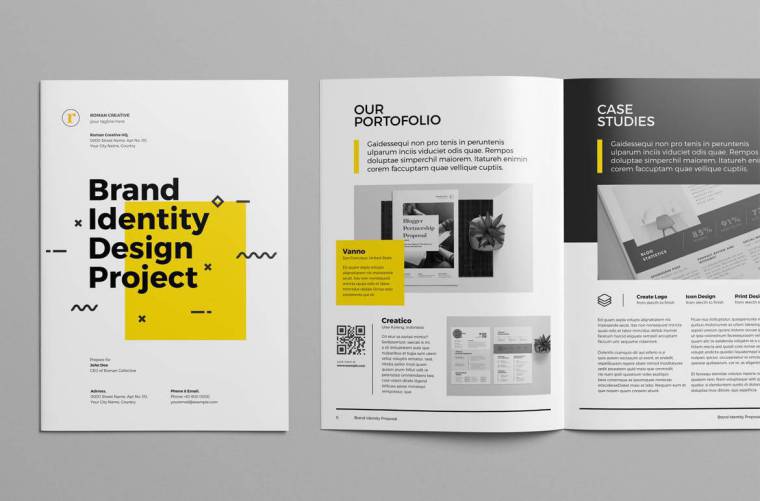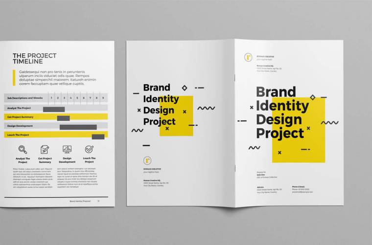 高品质的时尚高端新孟菲斯品牌手册画册楼书杂志设计模板(indd),品牌识别提案是一种夏普和专业模板,用于品牌开发,品牌设计和营销,提供服务,产品包装和其他品牌推广。