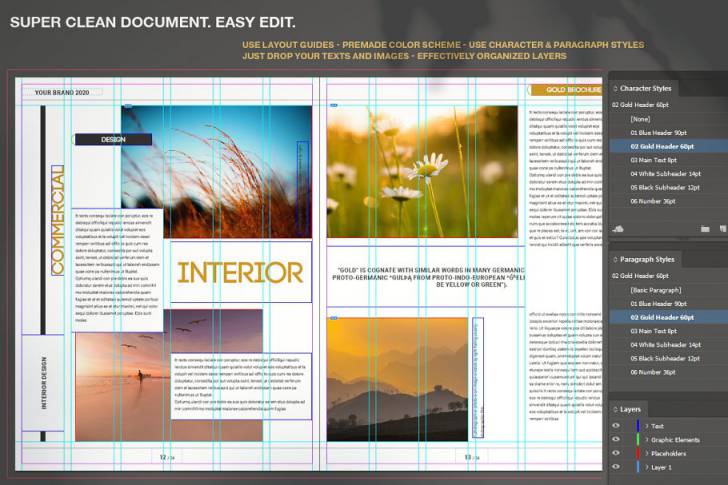 时尚金色主题企业宣传杂志画册模板,您可以将此模板用于任何行业,如时装、设计、摄影、艺术和商业项目。该模板具有极简的设计,包含了很多适合各种项目的页面布局。布局可以轻松混合和匹配,只需使用供应设计中的元素即可创建自己独特的布局。此模板也完全可编辑。模板中使用的任何元素(如文本、图形元素、图像、布局)都可以轻松自定义。特点:InDesign模板INDD:Adobe InDesign CC的兼容文件IDML:Adobe InDesign CS4,CS5,CS6的兼容文件PDF帮助文件打印尺寸:美国信纸(8.5 x 11.0英寸)CMYK,300 DPI,预留出血位自动页码编号通过调色板编辑品牌颜色分离图层上的图像,文本和图形易于定制使用免费字体