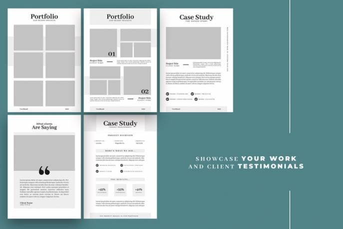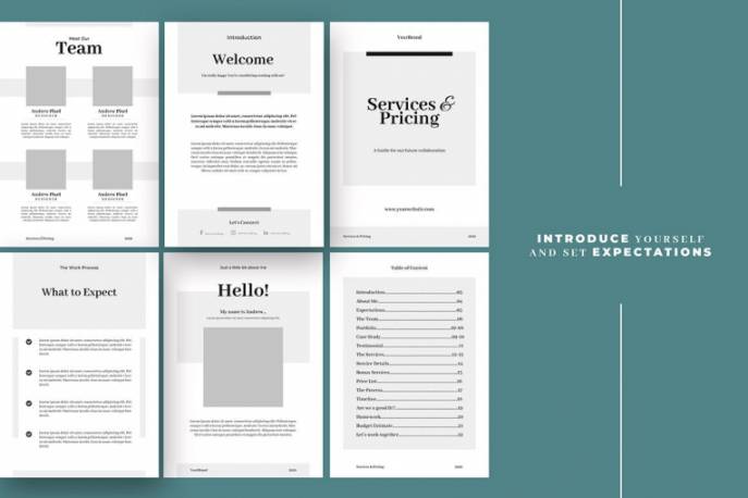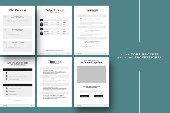 在此软件包中,您将找到展示服务,工作流程,时间表,任何潜在的追加销售,设定期望,展示您以前的工作和投资组合,介绍团队,提供案例研究和客户参考等所需的所有模板。 !