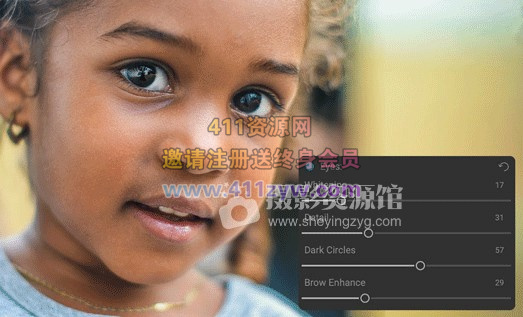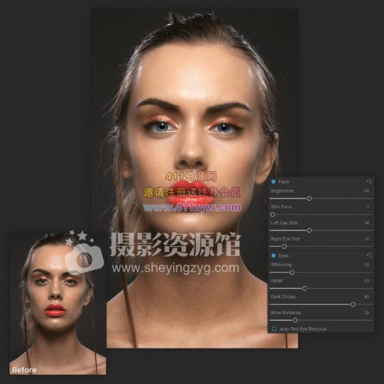 眼睛会被自动检测和增强。白色可以变亮,虹膜可以变亮。