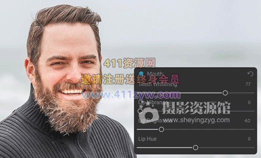 牙齿和嘴唇也会自动检测。您可以轻松调亮笑容并调整嘴唇的颜色和饱和度。