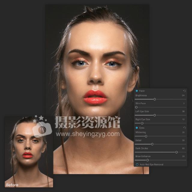眼睛会被自动检测和增强。白色可以变亮,虹膜可以变亮。