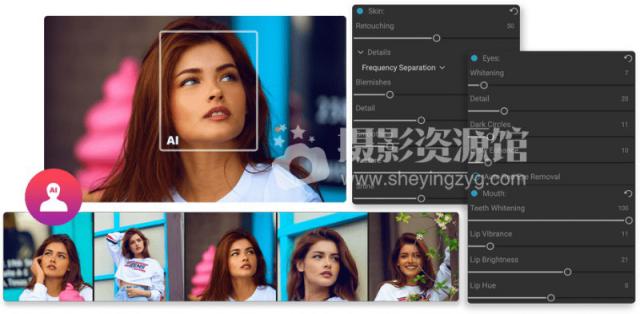 牙齿和嘴唇也会自动检测。您可以轻松调亮笑容并调整嘴唇的颜色和饱和度。