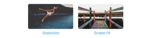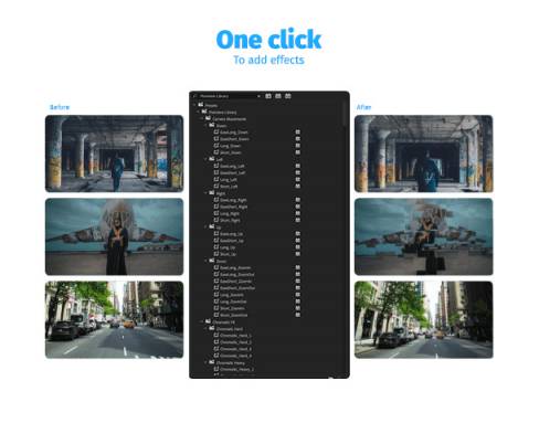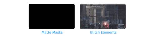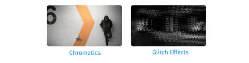 包含超过800组视频特效预设,例如RGB色彩分离、信号损坏、摄像机移动、视频转场、视频调色、扭曲、模糊移轴、光效叠加、图形遮罩、小元素等,多个效果可以相互叠加,支持任何分辨率