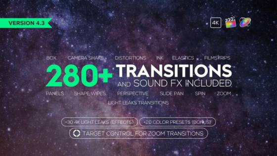 FCPX冲击缩放平移滑动扭曲水墨炫光转场插件 286个含音效素材