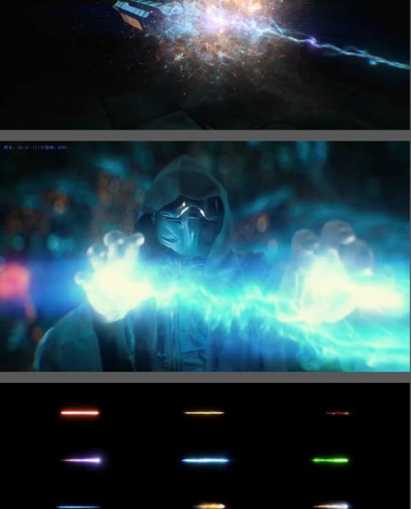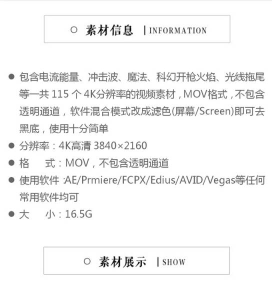 包含电流能量、冲击波、魔法、科幻开枪火焰、光线拖尾等一共115个4K分辨率的视频素材,MOV格式,