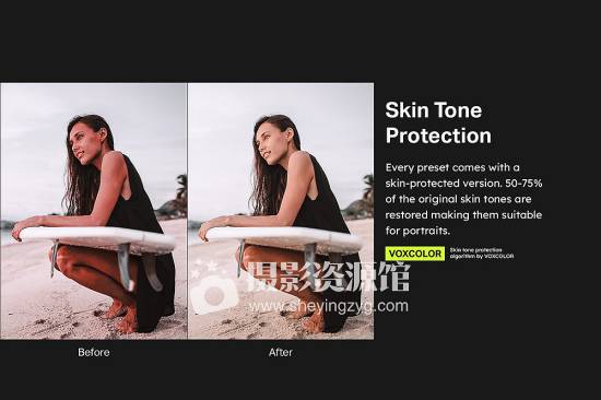 最后,每个预设都有一个皮肤保护版本。voxcolor的这个算法恢复了25-50%的原始肤色,让你无论是拍摄风景还是肖像都能获得一致的视觉效果。