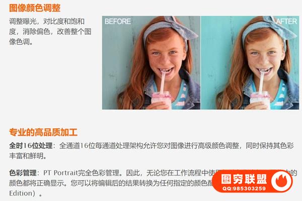 色彩管理:不论您在自己的照片处理流程中使用的是何种色彩空间,PT Portrait都能够保证色彩的正确显示。并且,在工作室版本中,您可以将输出图片转换至任意指定色彩空间。
